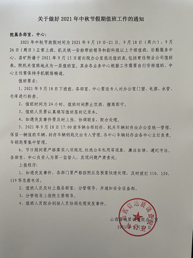 关于做好2021年中秋节假期值班工作的通知