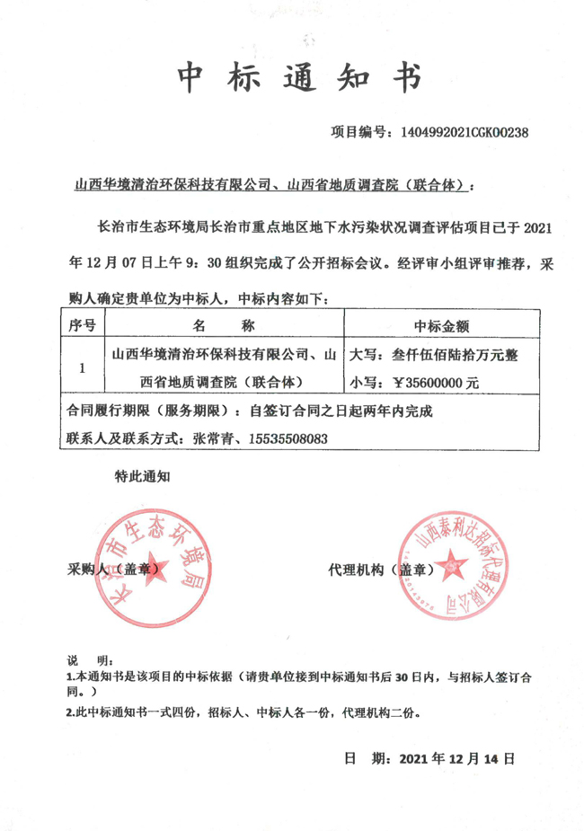 省地调院与山西华境清治环??萍加邢薰咀魑咸逵?021年12月7日参加“长治市生态环境局长治市重点地区地下水污染状况调查评估”项目公开投标,并成功中标,金额为3560万元,项目周期2年。