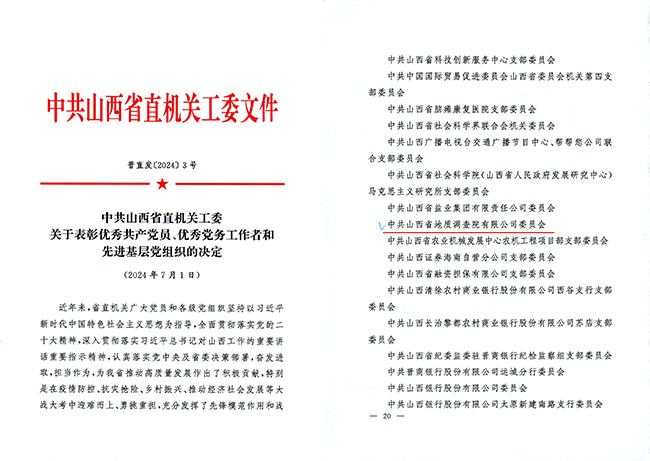 在庆祝中国共产党成立103周年之际,省直机关工委下发了表彰省直机关优秀共产党员、优秀党务工作者和先进基层党组织的决定,中共山西省地质调查院有限公司委员会获评“先进基层党组织”称号。