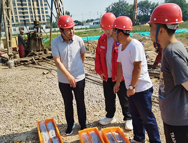 在项目部,郭红党详细听取项目负责人工作汇报,并查阅相关技术资料,对项目实施过程中有可能遇到的技术难点、安全隐患点逐一指出,并给出解决方案。随后深入项目钻探施工现场,对钻机运行、岩芯取样、动火作业、高处作业、临时用电、个体安全防护、特种作业人员持证上岗情况进行逐一检查,指出存在的安全隐患和不足,提出明确整改时限和要求。
