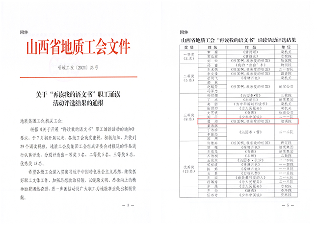 热烈祝贺地调院有限公司翟培同志在山西省地质工会及集团工会组织开展的“再读我的语文书”职工诵读活动中大放异彩!其选送的作品《祖国啊,我亲爱的祖国》荣获三等奖。
