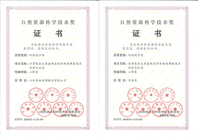 自然资源部自然资源科学技术奖励委员会于2024年10月评选出各类自然资源科学技术奖项。山西省地质调查院有限公司以公司党委书记、董事长李爱民和城市地质调查院院长黄虎城同志牵头的《汾渭裂谷太原盆地地区综合地质调查技术创新及应用》项目荣获自然资源科技进步二等奖。同时,黄虎城同志入选自然资源部高层次科技创新人才工程,荣获“青年科技人才”称号。